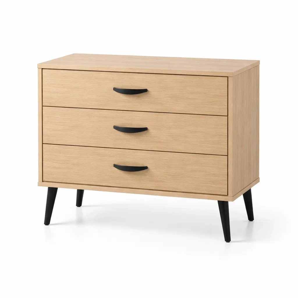 Cette commode est fabriquée en panneaux de fibres à densité moyenne plaqués bois, avec des poignées en métal peint.