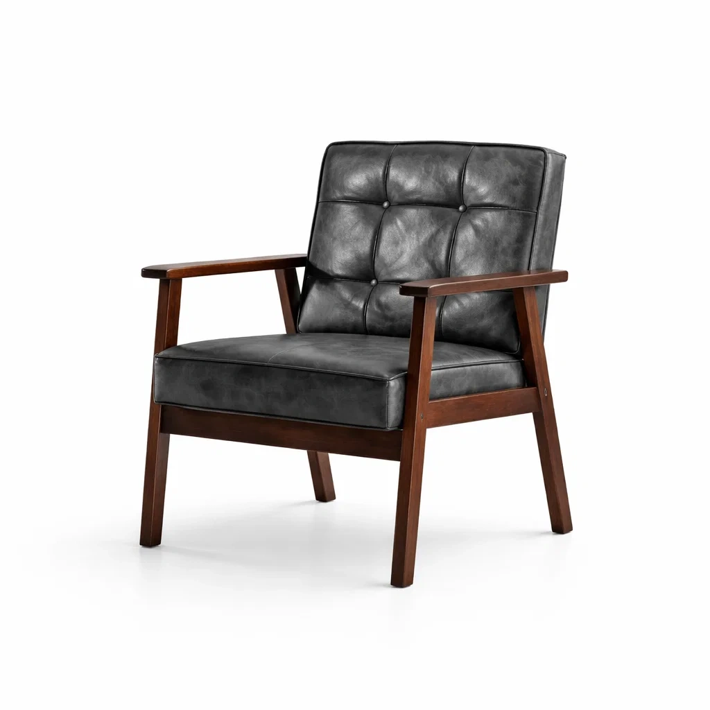 Ce fauteuil est fabriqué en bois avec un revêtement en cuir synthétique noir pour les coussins. La structure en bois est recouverte d'un vernis transparent pour une meilleure durabilité.