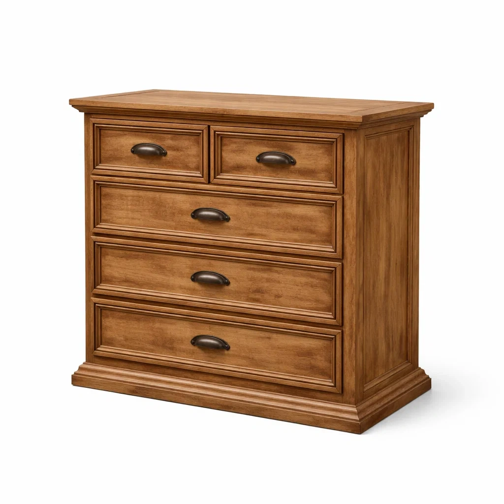 Commode en bois avec cinq tiroirs spacieux et poignées en métal.