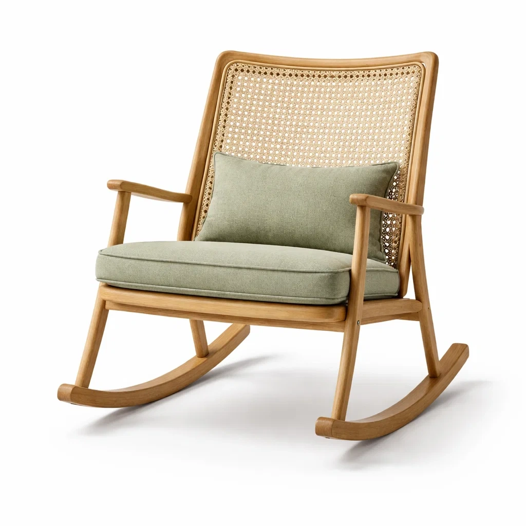 Structure en bois massif avec un dossier en rotin tressé. L'assise et le coussin sont en tissu polyester. La chaise a une capacité de charge maximale de 120 kg.