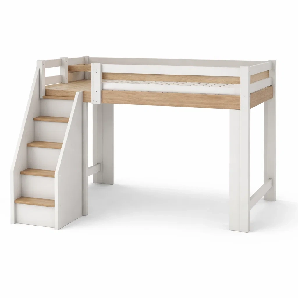 Ce lit surélevé est fabriqué en MDF et chêne avec un fini blanc et chêne. Il mesure 200 cm x 100 cm x 120 cm et peut supporter jusqu'à 100 kg. Le design inclut un escalier sécurisé intégré.