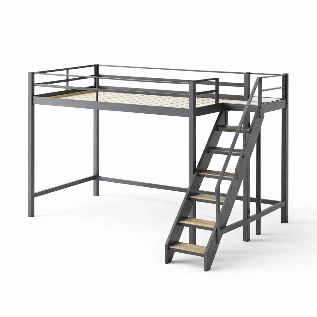 Ce lit mezzanine est fabriqué avec une structure en acier et des marches en bois massif. La conception maximise l'espace disponible.
