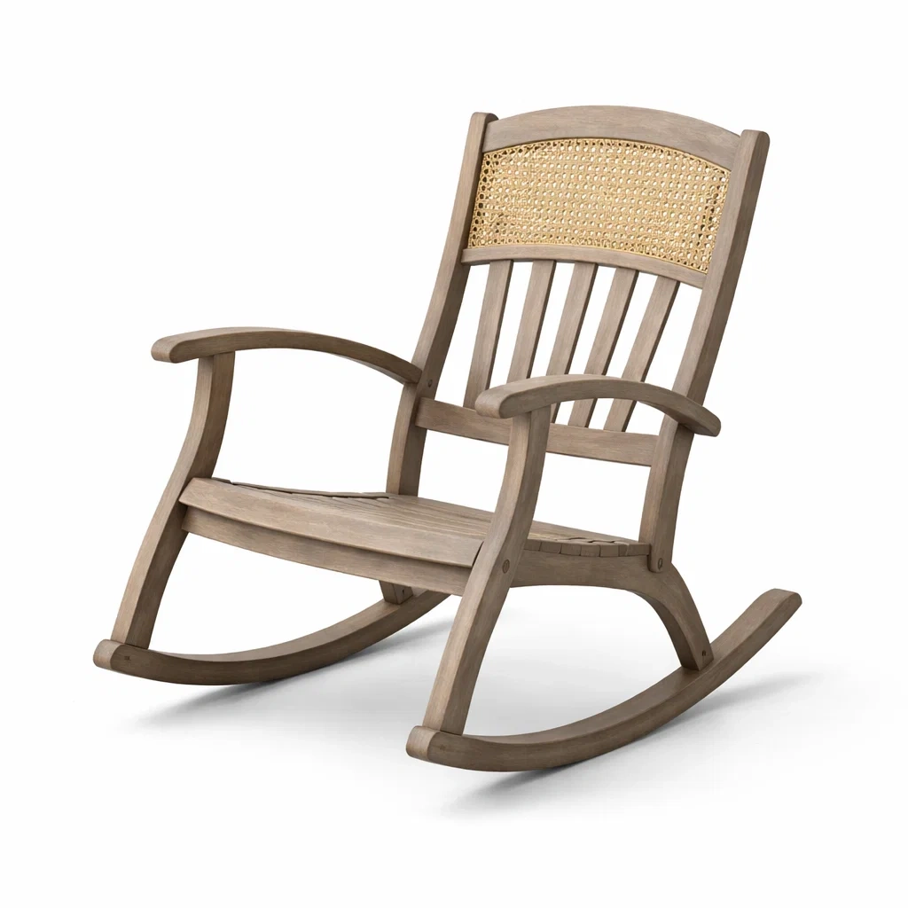 La chaise à bascule est fabriquée en teck et rotin naturel avec des dimensions de 90 cm de longueur, 65 cm de largeur et 110 cm de hauteur.