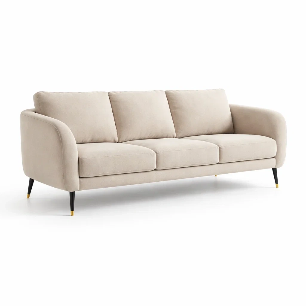Ce canapé 3 places est recouvert d'un tissu en polyester beige. Les pieds sont en métal noir avec des embouts dorés. Le canapé mesure 210 cm de longueur, 90 cm de largeur et 85 cm de hauteur. Les coussins sont rembourrés de mousse pour un confort optimal.